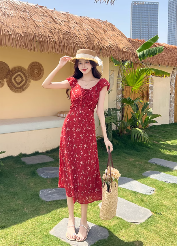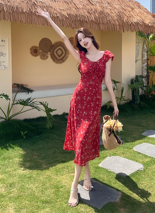 Simple Fashion Red Floral Design A-line Long High-waisted Dress HZ1024