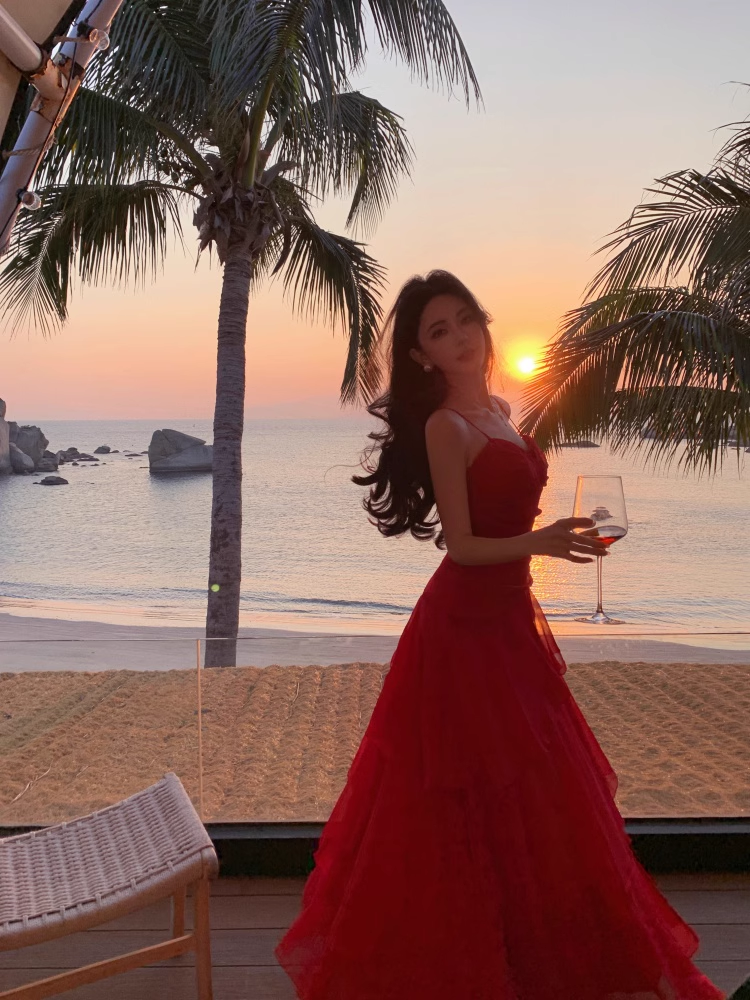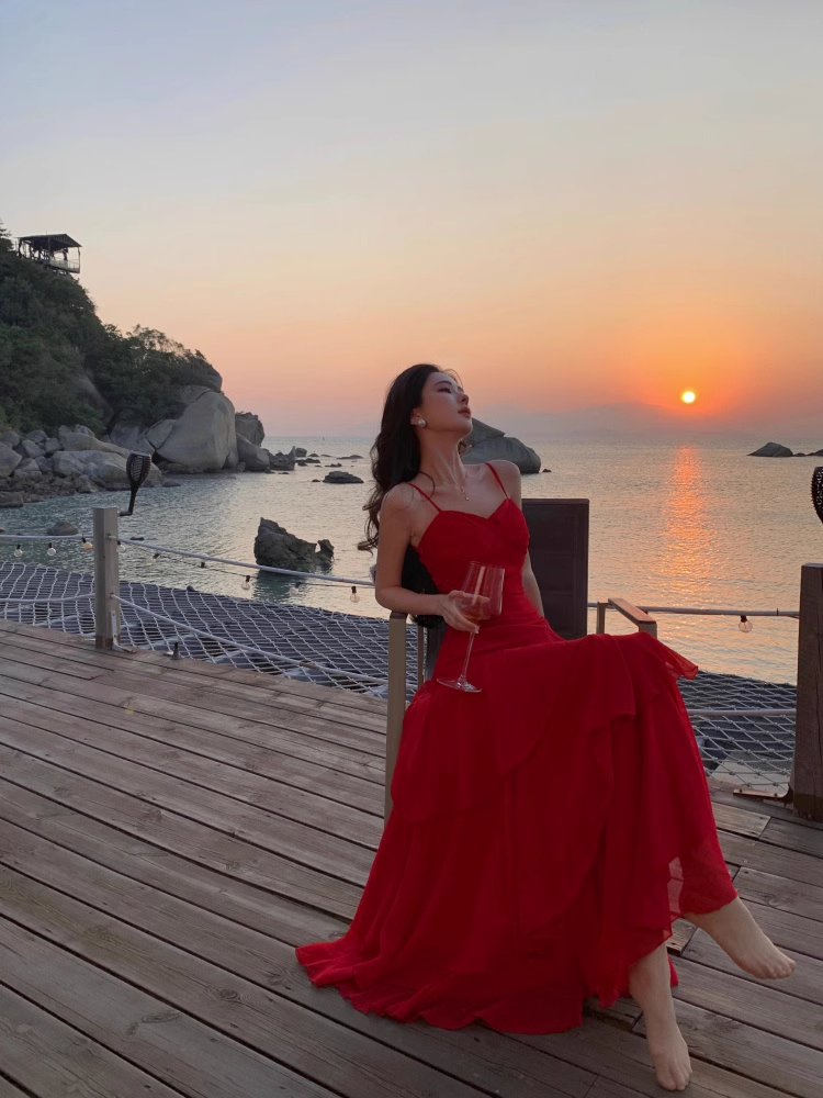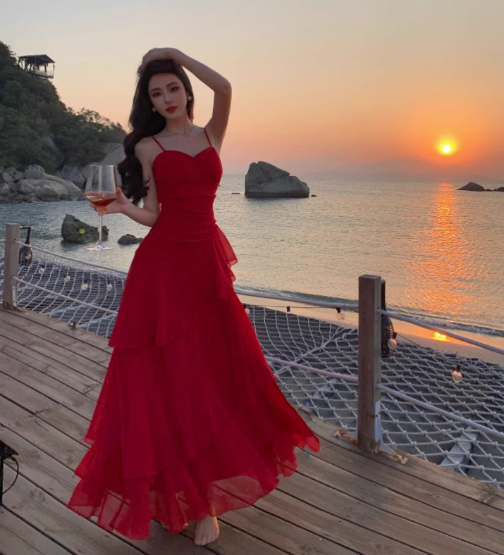 Vintage Ruffled Design Wine Red A-Line Women Spaghetti Strap Dress HZ1024