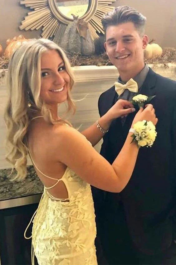 Vintage Yellow Floral Applique Spaghetti Strap Short Sheath Party Dress Cocktail Dress Homecoming Dress HZ1024